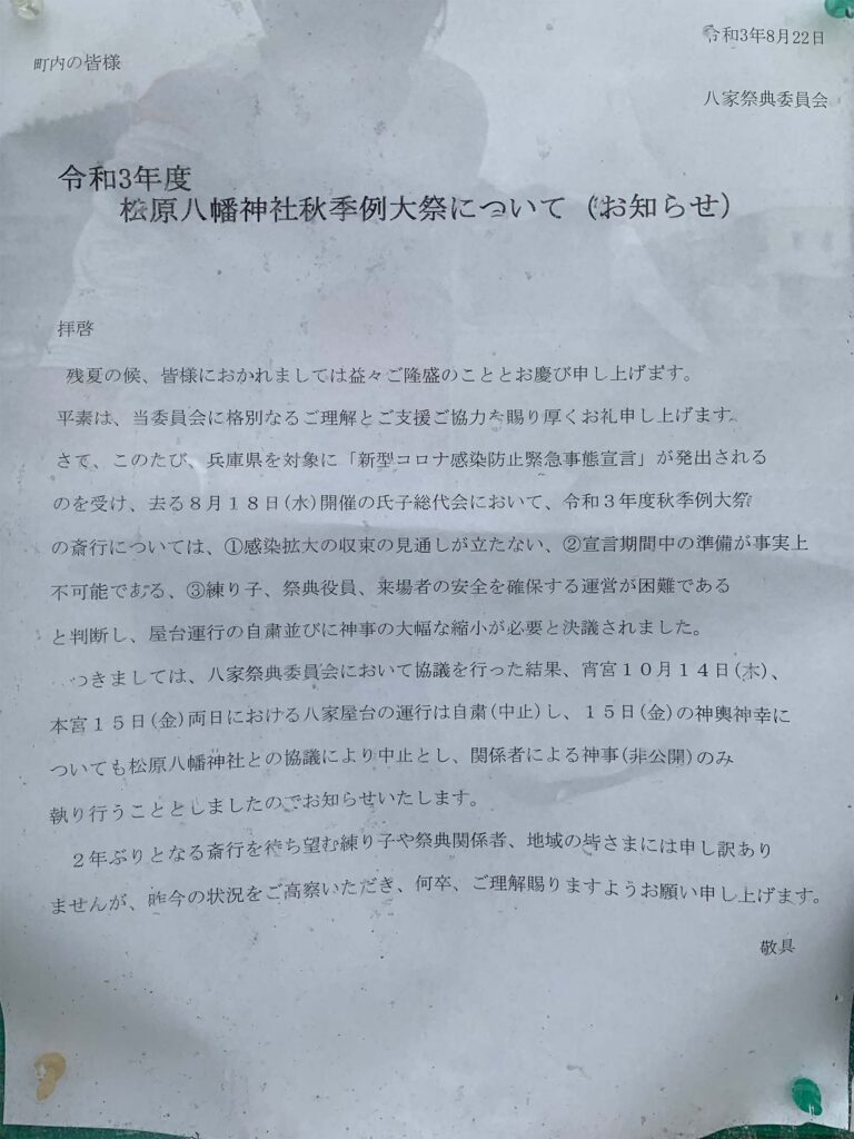2021年(令和3年)の松原八幡神社秋季例大祭・灘のけんか祭りの実施について、神事のみと発表がありました。